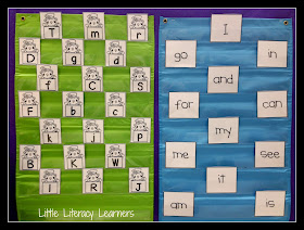 I start by writing out the sentences on sentence strips and placing them in the pocket chart. I model how we point to one word at a time when reading. Of course I make a mistake or two (I read "a" instead of "the" and insert the word "can") for the students to correct me. This helps ensure they are focusing on the words.